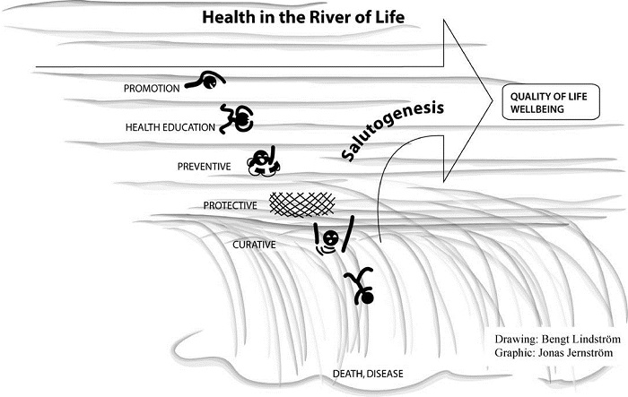 Ας φανταστούμε ένα μεγάλο ποτάμι – το ποτάμι της ζωής – με ένα ψηλό καταρράκτη [Εικόνα]. Στο πάνω μέρος αυτού του καταρράκτη εκατοντάδες άνθρωποι (οι επαγγελματίες υγείας) εργάζονται μανιωδώς προσπαθώντας να σώσουν εκείνους που έχουν πέσει στο ποτάμι και παρασύρονται από τον καταρράκτη (ασθενείς), πολλοί δε από αυτούς χάνονται τελικά από πνιγμό (θάνατος από ασθένεια). Καθώς οι άνθρωποι κατά μήκος της ακτής προσπαθούν να διασώσουν όσο το δυνατόν περισσότερα άτομα, εμείς, ως παρατηρητές, διαπιστώνουμε μια φαινομενικά ατελείωτη ροή ανθρώπων που ξεκινούν από πιο πάνω επίπεδα μέχρι τελικά να καταλήξουν στον καταρράκτη.