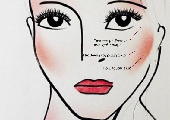 1.Εφαρμόστε μια βαθύτερη σκιά του ρουζ ακριβώς κάτω από τα μήλα των μάγουλων.